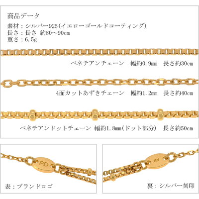 商品詳細 ブランド Pinky&Dianne (ピンキーアンドダイアン) 素材 シルバー925(イエローゴールドコーティング) 重量 約6.5g 長さ 約80〜90cm チェーン各サイズ ベネチアンチェーン:幅約0.9mm 長さ約30cm 4面カット小豆チェーン :幅約1.2mm 長さ約40cm ベネチアンドットチェーン :幅約1.8mm(ドット部分) 長さ約50cm ※モニターにより色の見え方が実際の商品と異なることがございます。