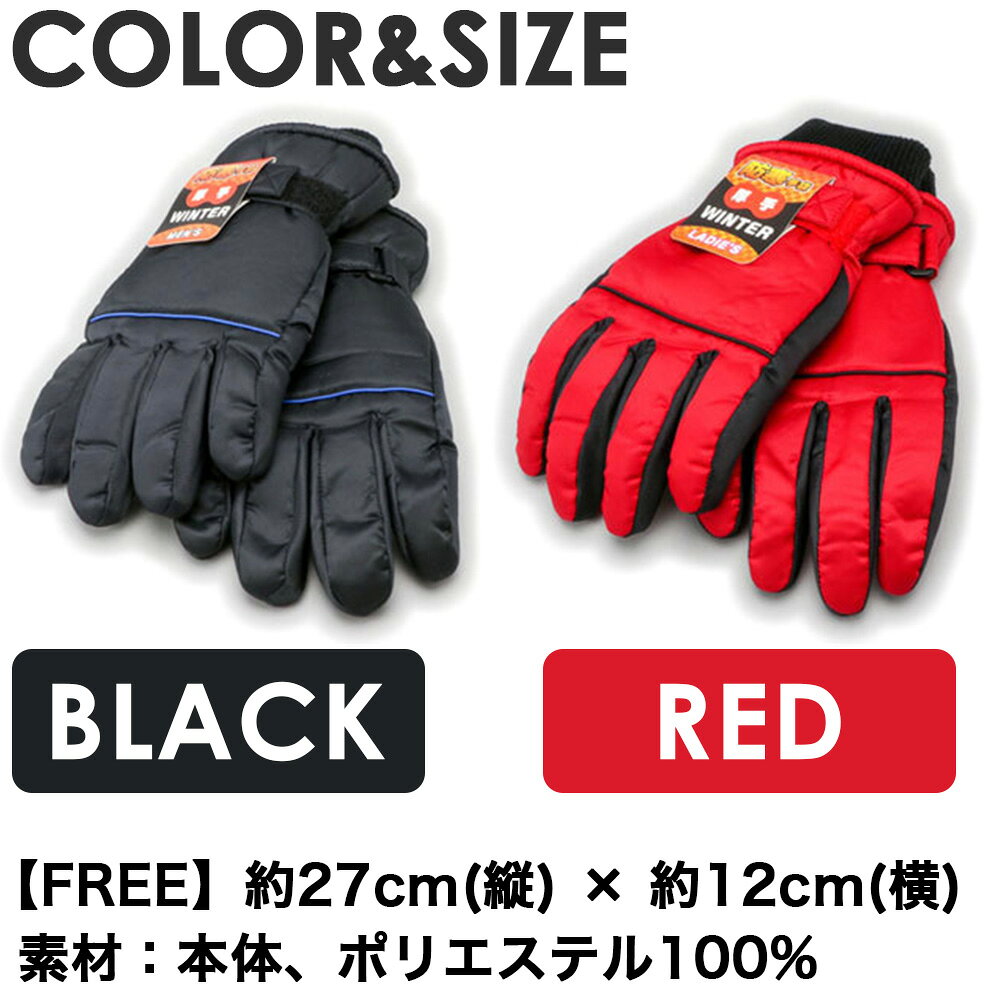 スノーグローブ レディース サイズ 【FREE】縦27cm×横12cm カラー ブラック/レッド 素材 本体:ポリエステル100% グローブはなぜ必要なのか? スキーやスノボだけではなく 雪遊びやその他のウィンタースポーツでも 冬を楽しむ為にはグローブは必需品です。